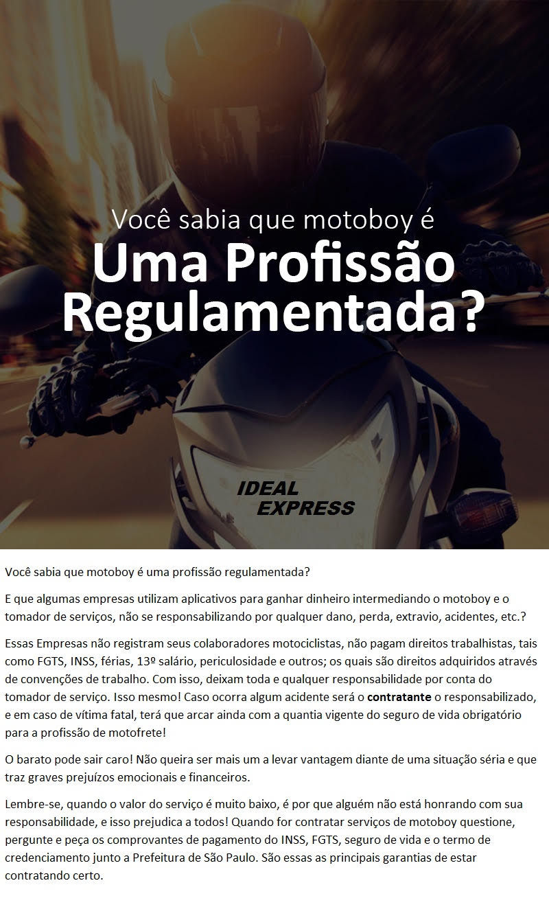 Desde 1990, a IDEAL EXPRESS opera no segmento de transportes e se preocupa cada vez mais com qualidade e segurança. É uma empresa legalmente constituída e devidamente regularizada conforme Lei 14.491 de 27 de julho de 2007 da Secretaria Municipal de Transportes.